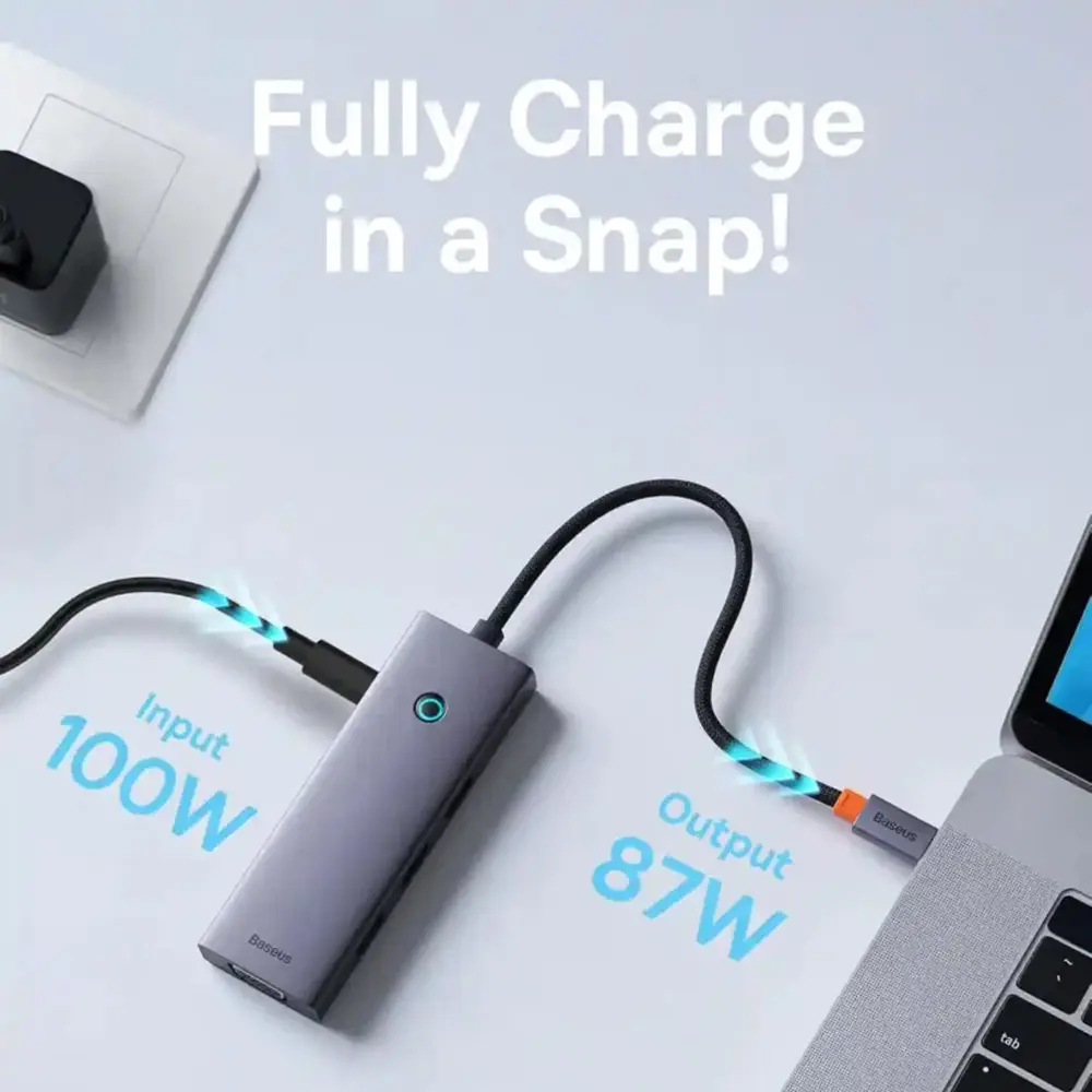 یکی از ویژگیهای برجسته هاب Baseus 7 in 1 Triple-Display Hub طراحی شیک و کاربردی آن است. این هاب با طراحی جمعوجور و بادوام خود به راحتی میتواند در محیطهای مختلف مورد استفاده قرار گیرد. بدنه آن از مواد مقاوم ساخته شده که از آسیبهای احتمالی جلوگیری میکند و طول عمر بیشتری به دستگاه میبخشد. با توجه به ابعاد مناسب، این هاب به راحتی قابل حمل است و شما میتوانید آن را بهراحتی در کیف لپتاپ یا سایر لوازم خود قرار دهید.