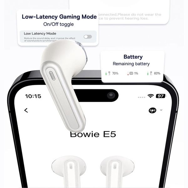 هندزفری وایرلس Bowie E5 از اپلیکیشن Baseus پشتیبانی میکند و امکان تنظیم دستورات لمسی، فعال کردن حالت Low-Latency و مدیریت اتصال چند دستگاه را میدهد. فناوری Dual-Channel Low-Latency تأخیر صدا را به حداقل میرساند و تجربه بازی و تماسهای آنلاین را روان و دقیق میکند. با این ویژگی، کاربران حرفهای گیمینگ و تماسهای کاری میتوانند تصمیمات سریع و دقیق داشته باشند.