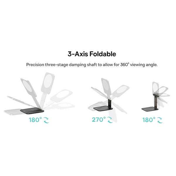 از انعطاف پذیری کامل با طراحی تاشو 3 محوره لذت ببرید. شفت میرایی دقیق، تنظیم آسان را امکانپذیر میکند و زاویه دید کامل 360 درجه را ارائه میدهد تا بتوانید تلفن خود را در هر جهتی برای مشاهده بهینه قرار دهید.