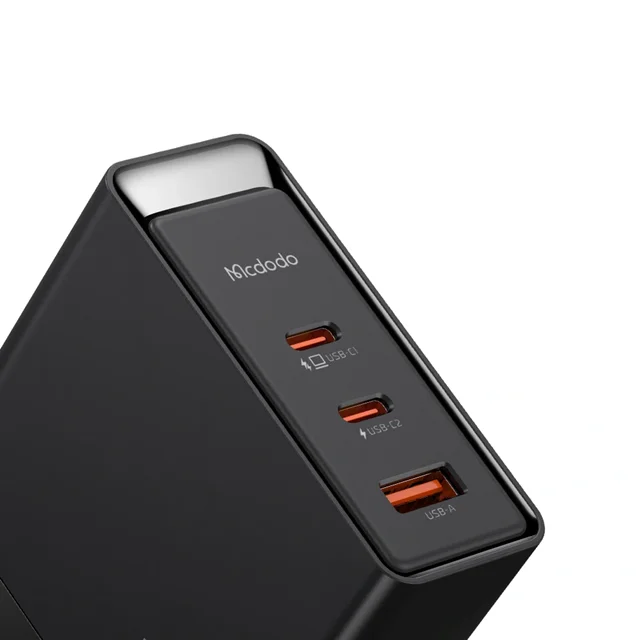 آداپتور شارژ Mcdodo 140W GaN5 Pro دارای 3 پورت است که شامل 1 پورت USB-A و 2 پورت تایپ سی میشود. این ویژگی به شما این امکان را میدهد که همزمان چند دستگاه را با استفاده از تنها یک شارژر شارژ کنید. این پورتها به شما این امکان را میدهند که گوشی، تبلت، لپتاپ، یا حتی دیگر دستگاههای دیجیتال خود را به طور همزمان شارژ کنید.