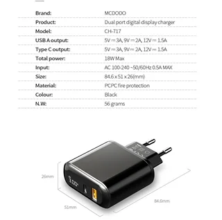 این شارژر دارای دو پورت خروجی USB و Type-C است . هر دوی این پورت ها هم دارای قابلیت های شارژ سریع هستند . ابعاد این محصول 26x51x84.6 میلی متر است