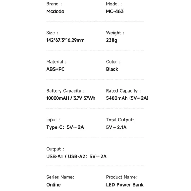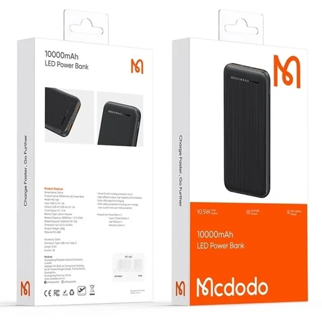 این پاوربانک دارای قابلیتهای محافظتی پیشرفته است که شامل حفاظت در برابر ولتاژ بیش از حد، جریان بیش از حد و دمای بالا میشود. این ویژگیها از دستگاههای شما در برابر خطرات مانند برقرسانی نامناسب یا دمای بالا حفاظت میکند و عمر مفید دستگاههای شما را بهبود میبخشد.به طور کلی، پاوربانک دو پورت 10000 میلیآمپر از Mcdodo با ویژگیهای پیشرفته خود مانند دو پورت USB، توان 10.5 وات، شارژ از طریق پورت تایپ سی و محافظتهای ایمنی، یک گزینه عالی برای کاربرانی است که به دنبال یک دستگاه پاوربانک با کیفیت و عملکرد بالا هستند .