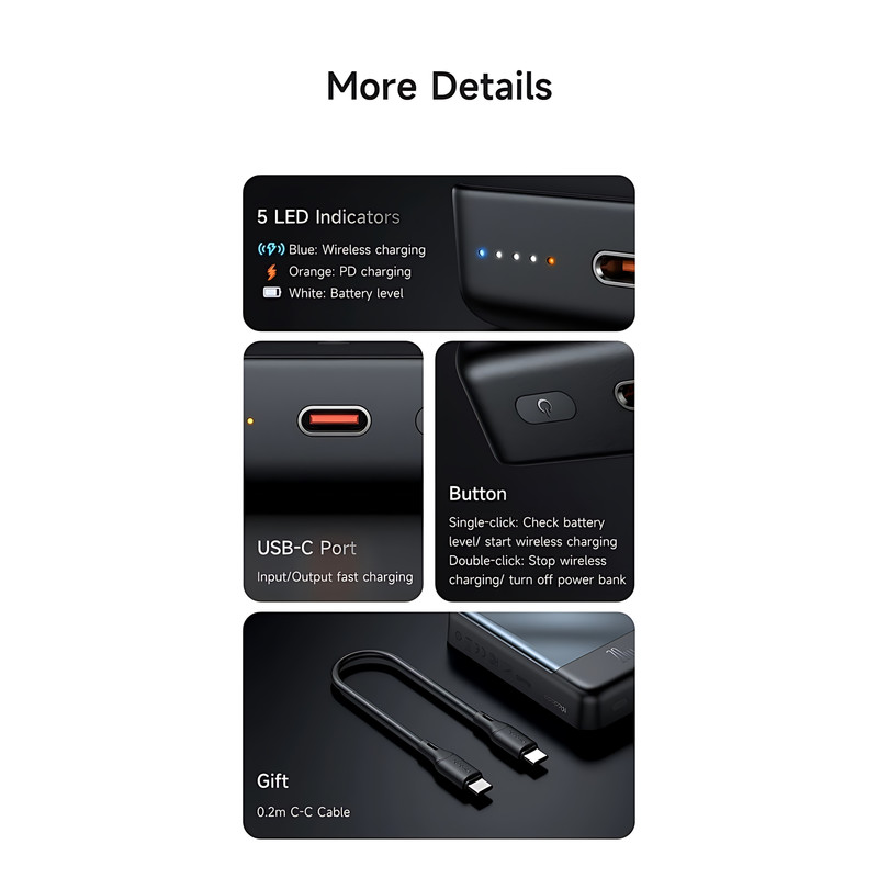 - سرعت شارژ بالا: با قدرت 15 وات در شارژ بیسیم و 20 وات در خروجی PD، این پاوربانک قادر است دستگاههای مختلف را با سرعت بالایی شارژ کند.