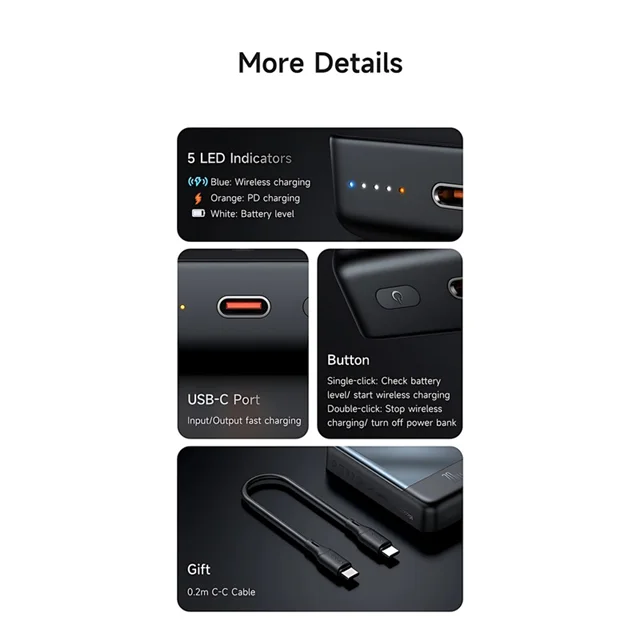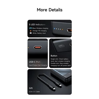 این پاوربانک با پشتیبانی از فناوری Power Delivery (PD) با قدرت 20 وات، امکان شارژ سریع دستگاههای مختلف از جمله گوشیهای هوشمند، تبلتها و دیگر گجتهای الکترونیکی را فراهم میکند.