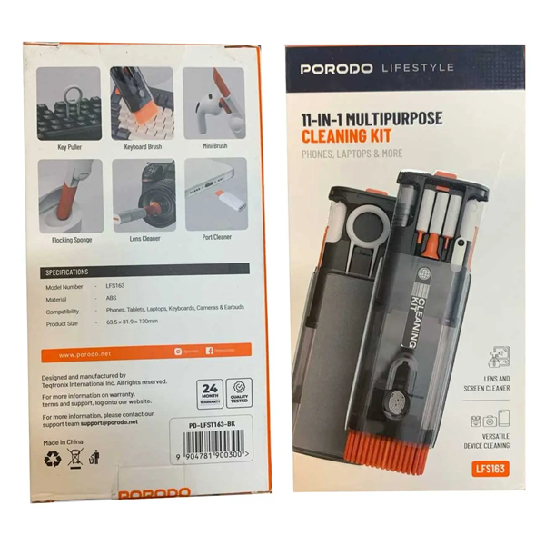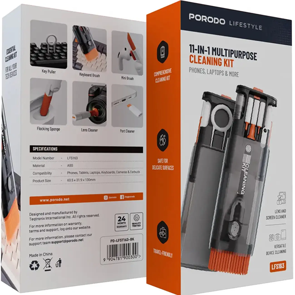 پاکیزگی دستگاه‌های دیجیتال یکی از دغدغه‌های اصلی کاربران است، زیرا گرد و غبار یا اثر انگشت می‌تواند عملکرد و ظاهر آن‌ها را تحت تاثیر قرار دهد. کیت تمیزکاری Porodo 11-IN-1 با ابزارهای تخصصی و مواد باکیفیت، امکان پاکسازی گوشی، تبلت، لپ‌تاپ، کیبورد، دوربین و هندزفری را به راحتی فراهم می‌کند. این مجموعه جمع‌وجور، استفاده آسان و حمل راحت در سفر را ممکن می‌سازد. با این کیت، دستگاه‌های شما همیشه شفاف و آماده استفاده هستند. آیا تا به حال به این فکر کرده‌اید که یک جعبه بتواند تمام نیازهای تمیزکاری دیجیتال شما را برطرف کند؟