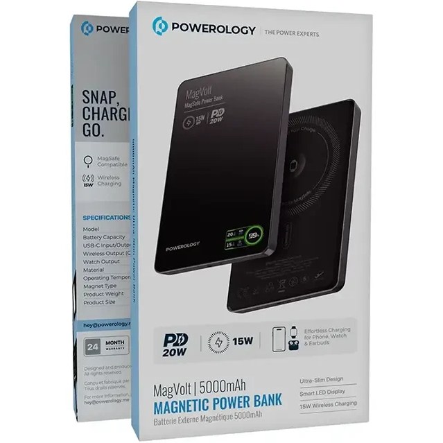 پاوربانک Powerology MagVolt دارای طراحی فوق باریک است که باعث میشود به راحتی در کیف، کوله یا حتی جیب قرار گیرد. این طراحی سبک و جمع و جور باعث میشود بدون اشغال فضای زیاد، همیشه پاوربانک همراه شما باشد. طراحی فوق باریک به ویژه برای افرادی که سفرهای کوتاه یا طولانی دارند، اهمیت دارد و باعث میشود بدون نگرانی از حجم وسیله، دستگاه خود را همیشه همراه داشته باشید.
